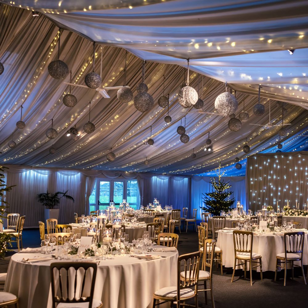 The dining room looked simply stunning- warm, festive and glowing with candlelight. Soft blue lights and beautifully decorated Christmas trees framed the space, while the oval top table was adorned with elegant candlesticks, floating candles, with cream and white florals by Kole Events. Cylinder vases filled with fresh foliage added a natural, wintery touch that brought the whole room to life.