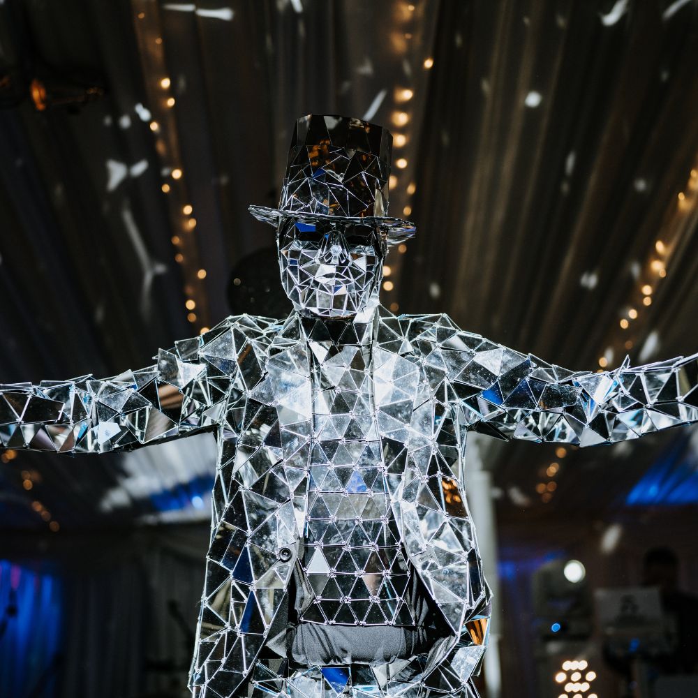 Mid-dinner entertainment then wowed guests with an electrifying dance routine by Stage Invaders, dressed in sparkly silver flared outfits and performing to some of the era’s most iconic tracks. The energy soared when they were joined by the Mirror Man and the disco head performer from Stage Invaders, fully immersing guests and encouraging everyone to join them on the dance floor.