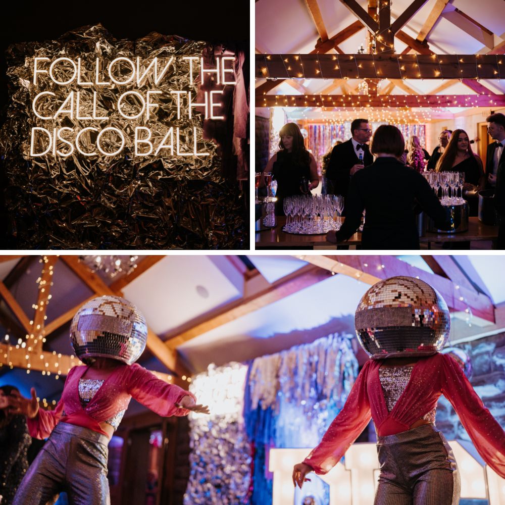 At 7pm, guests were instantly enchanted as they approached the venue, welcomed by shimmering disco balls and shining stars, with abundant gobo projections by Lightech. Passing through a tassel curtain in hues of pink, purple, blue, and silver, they entered a dreamy disco paradise. Light-up letters spelling DISCO, surrounded by disco balls, a multicoloured foil backdrop displaying a glowing neon sign, for Follow the Call of the Disco Ball, set the tone perfectly, provided by Love Lights the Way. Purple lighting and uplighters from Lightech bathed the space in a vibrant glow, while the Stable Yard Catering Bar team greeted guests with arrival drinks. Guests posed for photos in front of the backdrop, enjoying Prosecco, Peroni and refreshing fruit coolers before stepping into the bar area.