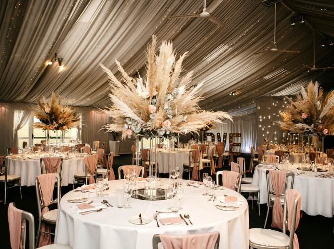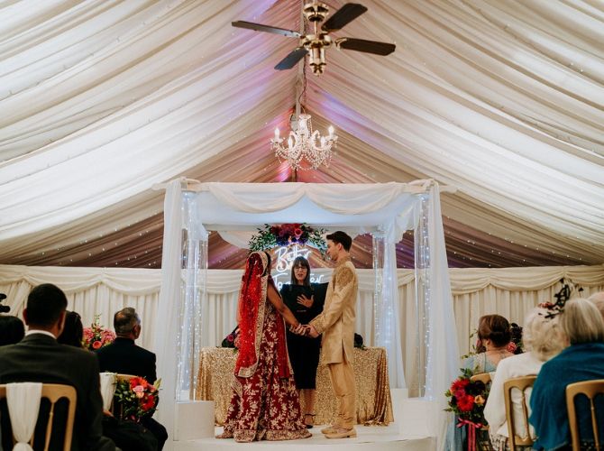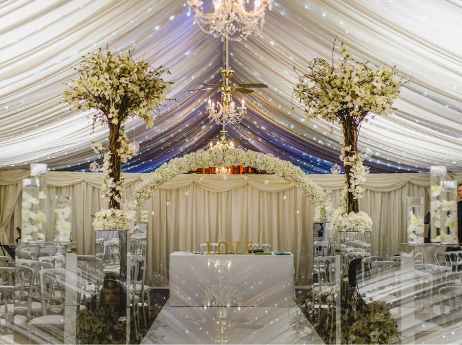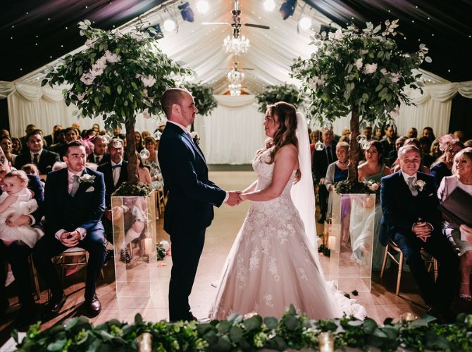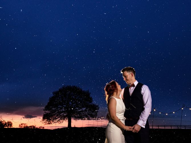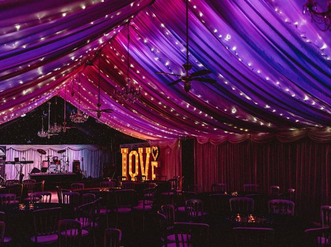 For that first moment you stand together as newlyweds, whether intimate, dramatic, or showstopping, we have the perfect indoor space for you. For a more intimate ceremony, our oak-beamed barn features original handcrafted sandstone walls dressed with twinkly fairy lights to frame your photos, while unforgettable countryside views provide a stunning backdrop. You can even get married under the stars for an enchanting, romantic scene as a magical night sky illuminates everything around you. Enjoy timeless, intimate elegance under the pleats, with beautiful ivory decor and classic drapes that allow you to add your own style to the ambience.
