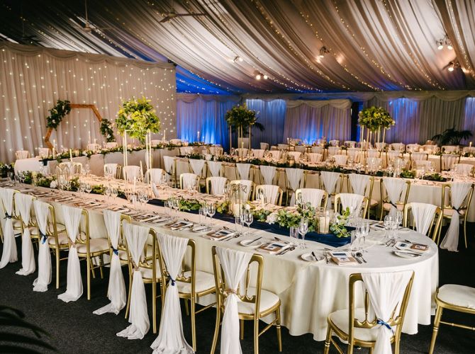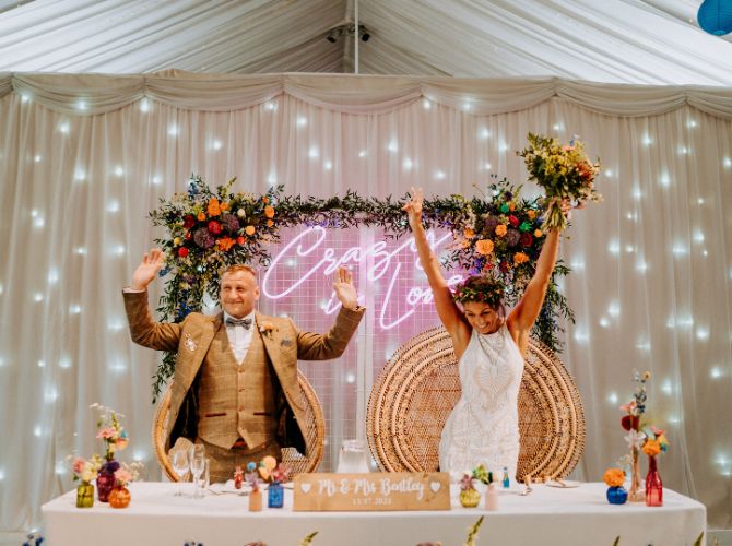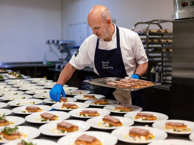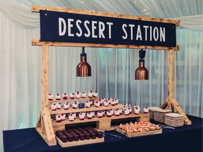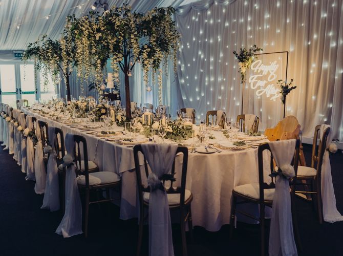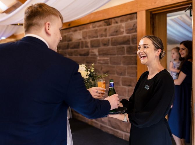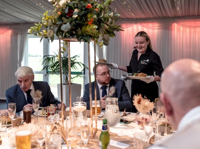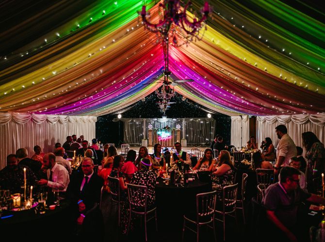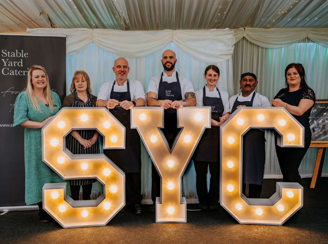 Explore our indoor ceremony optionsOur incredible Steele’s Barn is the perfect dining space, marquee-lined and adorned with coloured downlights and twinkly fairy lights – truly breathtaking! Whether you prefer a classic top table, a romantic sweetheart setup, or relaxed long tables, every arrangement is completely bespoke to your guest numbers and requirements. Our on-site caterers, Stableyard Catering, will serve your delicious wedding breakfast and drinks, offering options to suit both formal and informal dining styles, with food and drink that really get your guests talking.